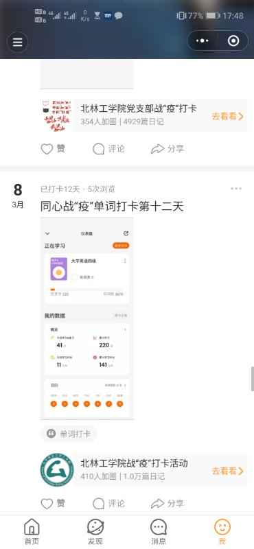 有的同学参加学院组织的21天打卡活动(图4苗泽晨打卡截图、图5杨东晓打卡截图);