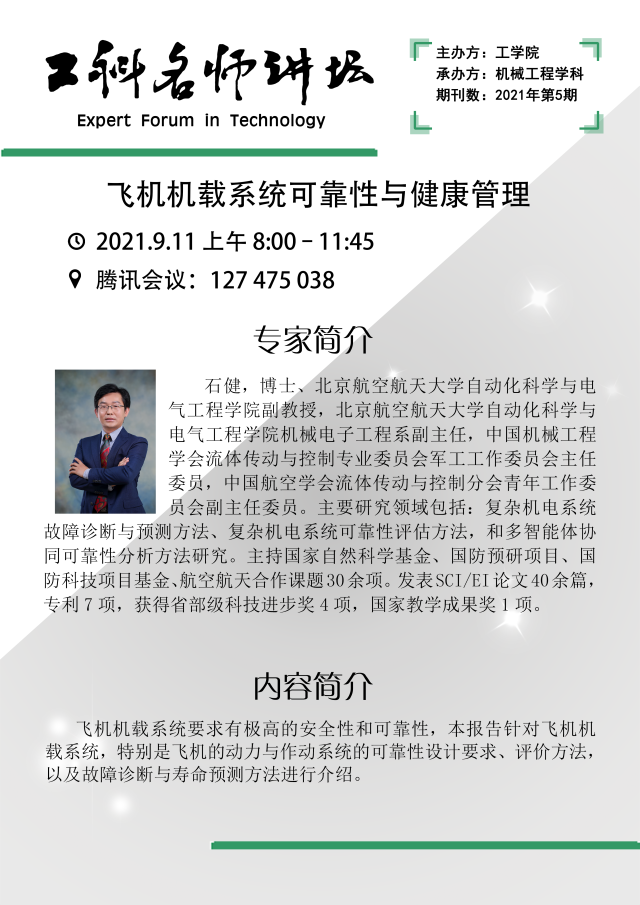 工科名师讲坛2021:飞机机载系统可靠性与健康管理