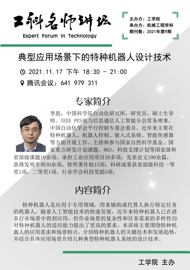工科名师讲坛2021:典型应用场景下的特种机器人设计技术