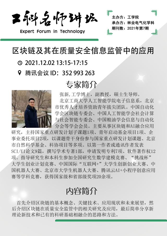 工科名师讲坛2021:区块链及其在质量安全信息监管中的应用