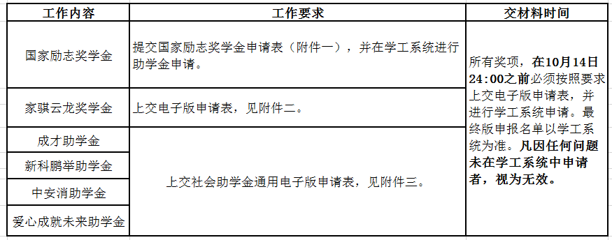 12018年评优工作中,申请表上交邮箱和学工系统申报同时进行,有意申请各类助学金的同学务必在1014(周日)2400之前将电子版提交至ceping123456@126.com,学工系统开放的申请项目和邮箱中的申请表一致,方为有效,如遇系统问题需要延时,会在信息群另行通知。