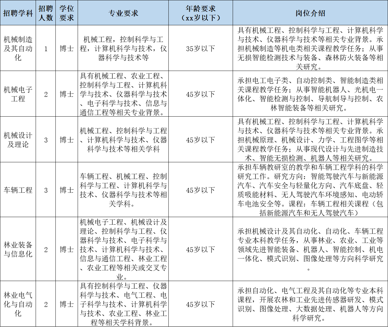 教师岗位招聘面向应届毕业生、留学回国人员、博士后、工作调动人员,岗位具体要求及详细信息请登录“北京林业大学招聘网(http://zhaopin.bjfu.edu.cn)查看,简历投递时间至202310月31日,岗位招满即止。