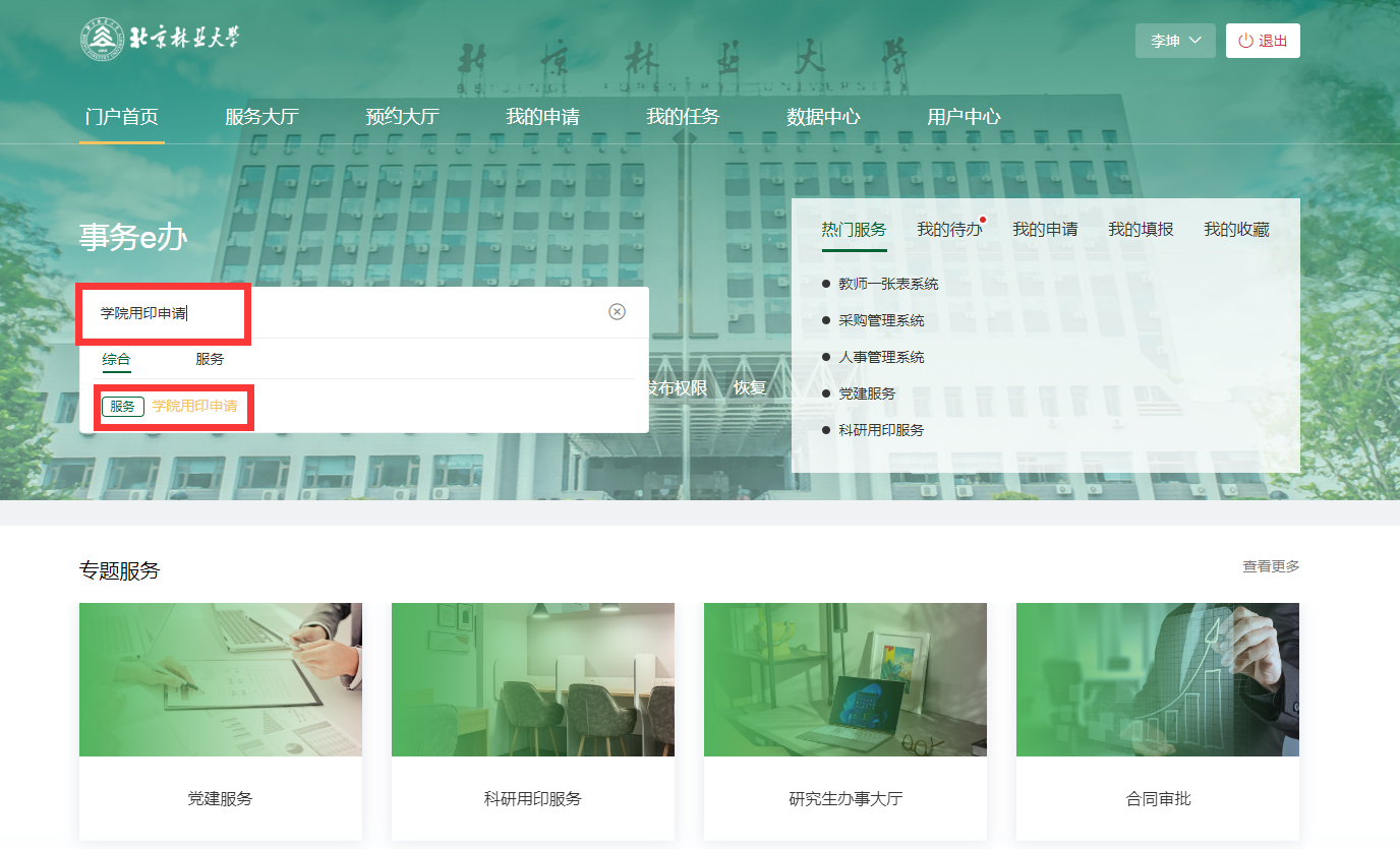 2.点击上方“事务e办”,搜索关键词“学院用印申请”。
