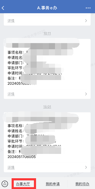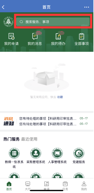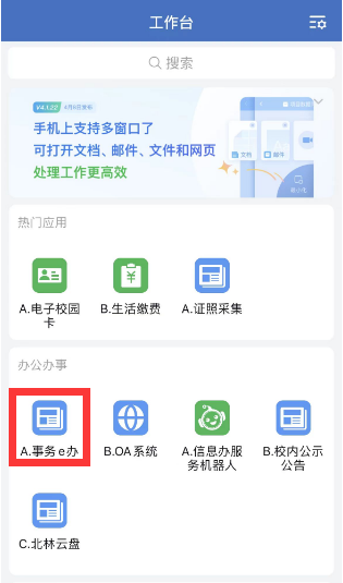 1.打开“企业微信”,点击“工作台—事务e办—办事大厅”,搜索关键词“学院用印申请”。