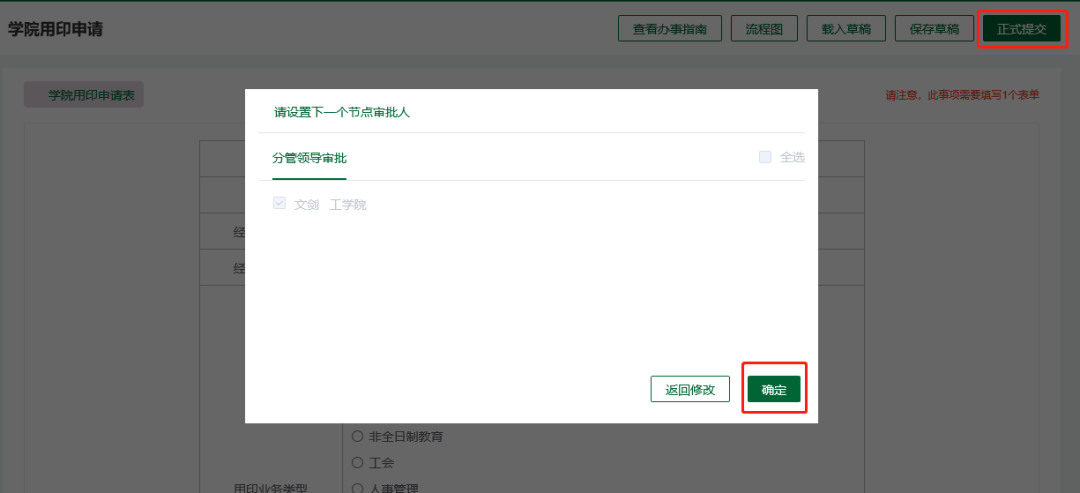 2.完成表单填写后,点击右上角“正式提交”,选择相应分管领导审批后,点击“确定”即可完成申请。