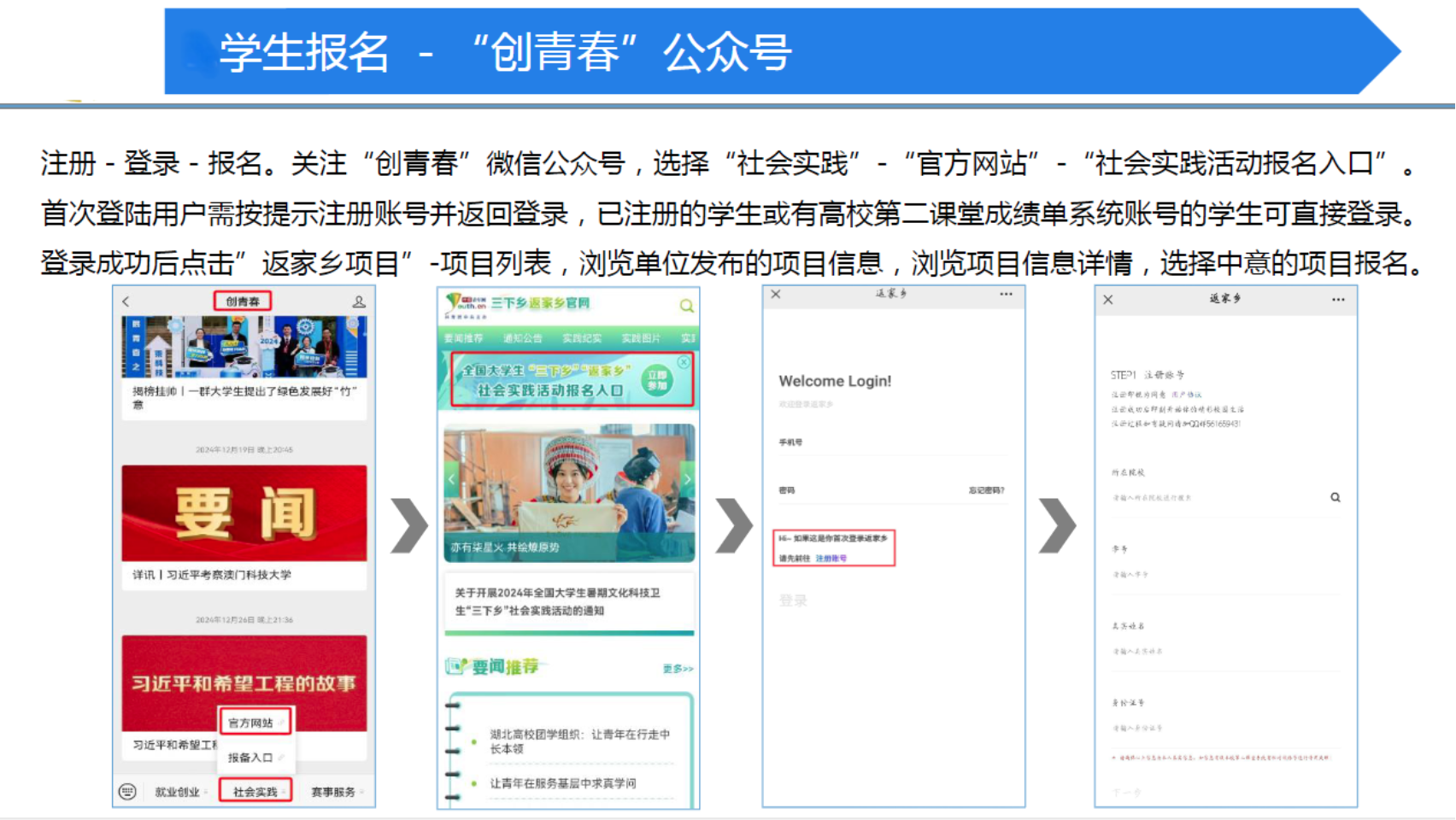 申请流程:在“创青春”微信公众号的“社会实践”栏目入口登录“官方网站”“社会实践活动报名入口”“返家乡项目”,按分类、区域搜索岗位信息,确认选择合适的岗位后,填报并提交报名信息,等待审核和系统提示信息,按信息指示开展后续操作。通过双向选择方式录取。