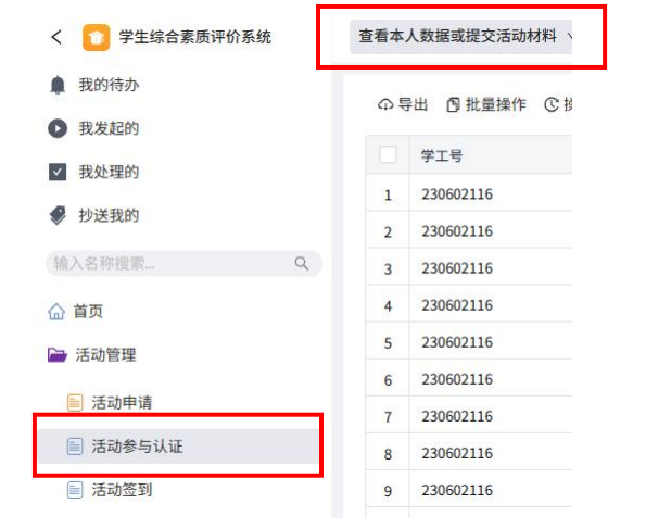 活动管理——活动参与认证(左上角勾选“查看本人数据或提交活动材料”),即可显示当前已录入系统的活动参与认证数据。