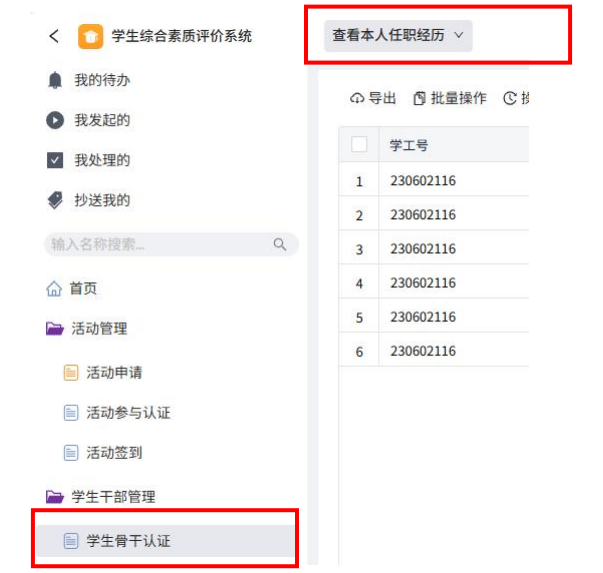 学生干部管理——学生骨干认证(左上角勾选“查看本人任职经历”),即可显示当前已录入系统的学生骨干认证数据。