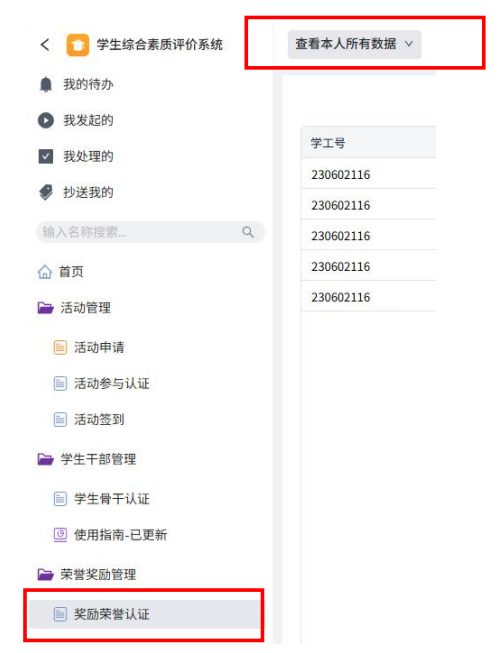 荣誉奖励管理——奖励荣誉认证(左上角勾选“查看本人所有数据”),即可显示当前已录入系统的美育/体育/劳育竞赛及活动的获奖认证情况,以及德育部分个人荣誉/集体荣誉的荣誉称号认证情况。
