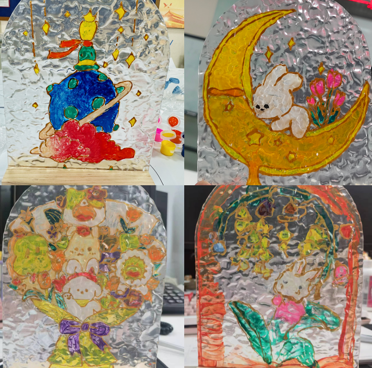 活动现场,参与同学各自领取材料包,通过观看教学视频学习玻璃彩绘的勾勒技巧和涂色方法。在轻松愉快的氛围中,同学们沉浸于玻璃画的创作中,经过描边勾勒,选色,调色,上色,“小王子”、“玉桂狗”、“小兔子”等图案在玻璃上逐渐显现,在阳光下缤纷闪耀,营造出光与影交织的梦幻效果。