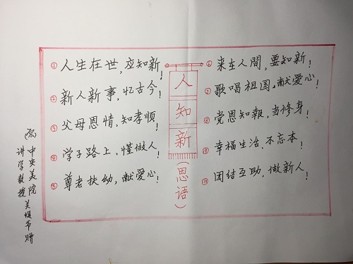 活动结束前,一位中央美院老教授为同学们赠送礼物,上面写满老爷爷对新一代人的期望,教会同学们如何做人做事、如何对待父母、对待国家。同时,上面还为同学们写有专属的名字、画有专属的生肖像。