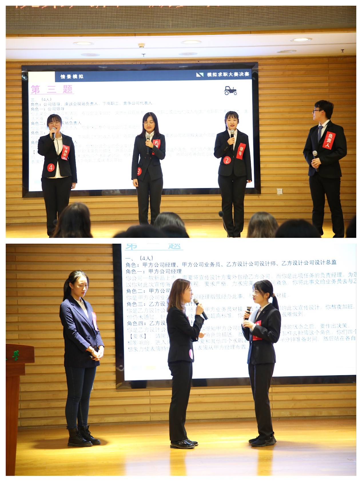 本届模拟求职大赛共有35名学生报名参赛,经过简历筛选、无领导小组讨论等环节,最终共有8名学生脱颖而出进入决赛。决赛共分为自我展示、情景模拟、压力面试、选手互评和评委点评五个环节。其中,情景模拟角色扮演展示环节,8位选手分工合作,逻辑缜密,各展风采;压力面试和选手互评环节中,选手面对抽取的题目灵活应变,从容作答。最后,评委老师对每位选手的现场表现进行了针对性的细致点评,分别指出8位选手的优点和不足,并提出指导性意见和建议。
