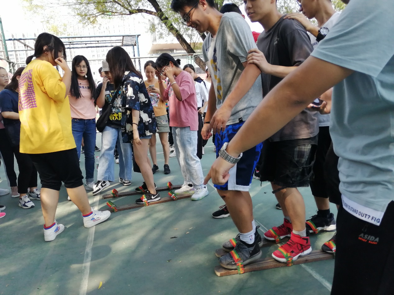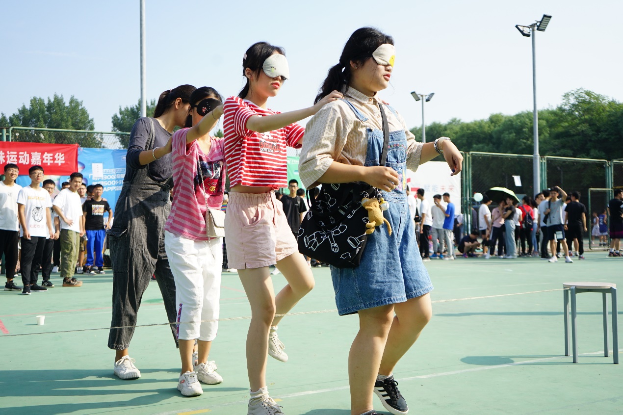 本次趣味运动会以宿舍为单位开展,同一寝室的同学相互配合、共同协作完成蒙眼指路、板鞋接力、并脚作战等多个趣味集体项目,在游戏中增进了了解、加强了默契、增添了信任,彼此之间的感情和距离都更近一步。