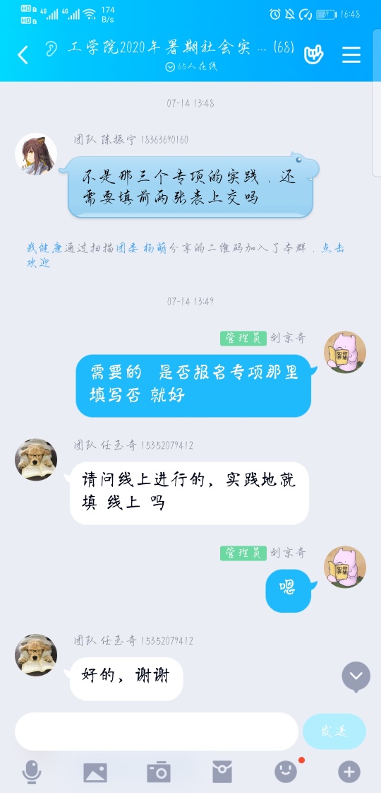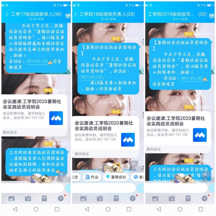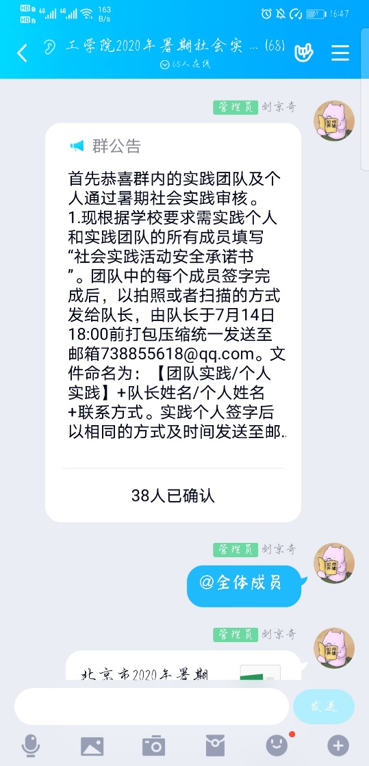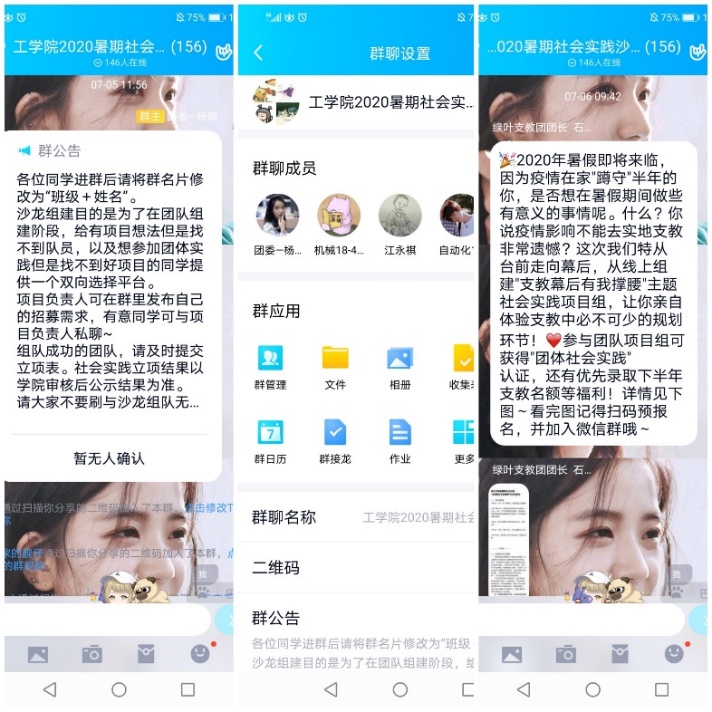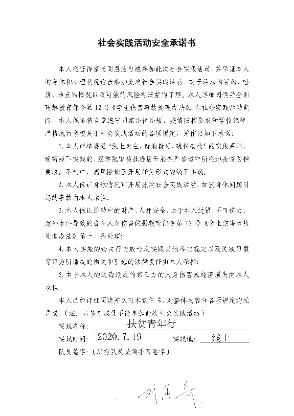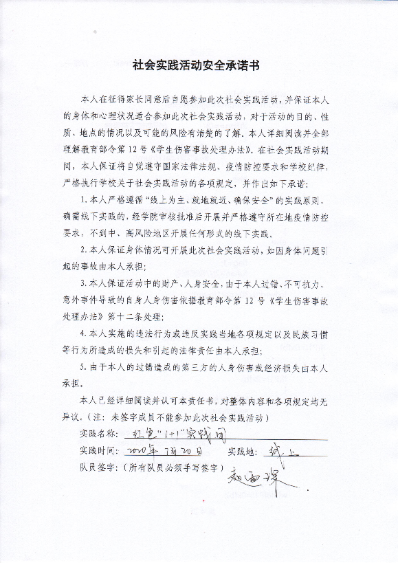 建立2020年暑期社会实践联络群,帮助各团队及个人解决实践中遇到的各类问题,学院团学骨干实时了解同学们的实践情况,及时反馈至学院。密切关注线下实践团队,保证实践成员的生命财产安全,严格要求各实践团队及个人签署安全承诺书,为同学们的安全保驾护航。