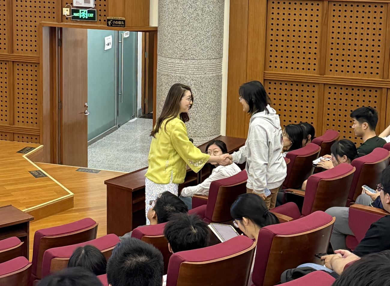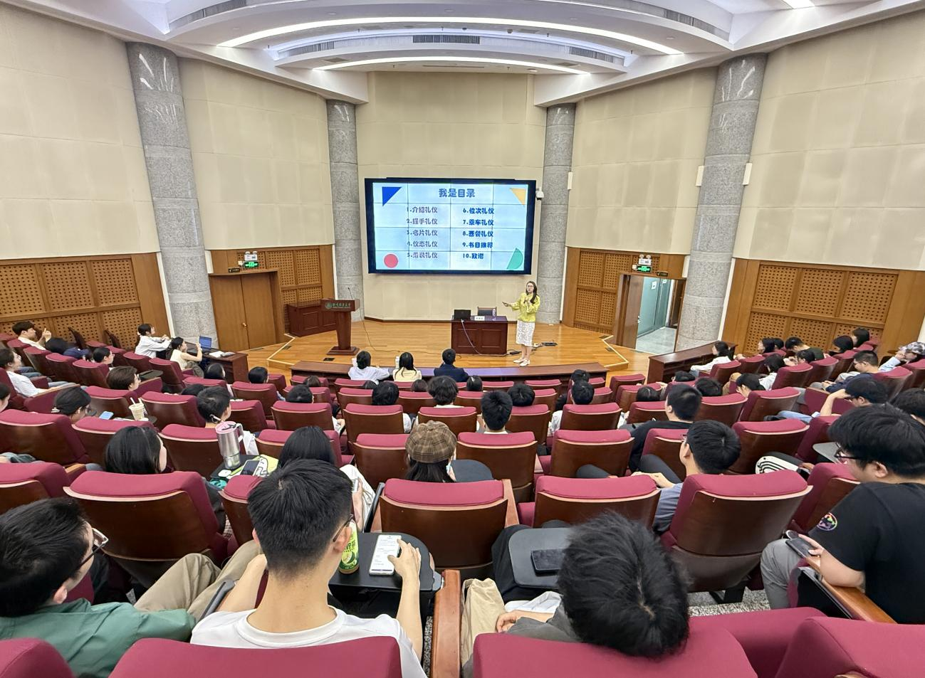 张雅洁以“礼仪之道,雅韵生辉”开篇,强调“礼仪是融入社会、立足职场的金钥匙。”她结合实际生活场景与职场规范,通过互动式教学、场景化教学、现场演示等教学方法,依次讲解了介绍礼仪、握手礼仪、名片礼仪、仪态礼仪、着装礼仪等9方面商务礼仪的规范要点,通俗易懂的语言、深入浅出的讲解、生动翔实的案例让参与学生在轻松愉悦的氛围中受益颇深。