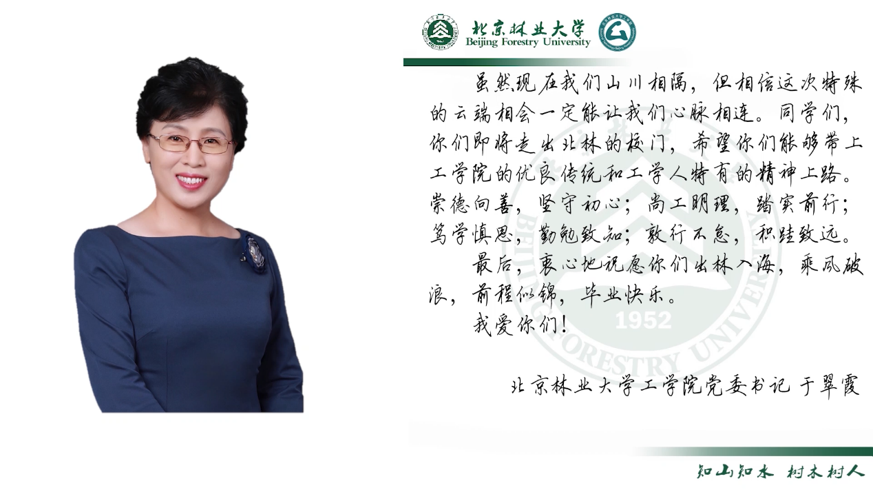 于翠霞书记以“云端“书信的方式为2020届毕业生送上赠言,与同学们共勉。她首先表达了对同学们的不舍与思念,同时对同学们对于疫情防控工作的理解和居家生活完成学业的坚持表示了感谢;希望2020届工学人能够带上工学院的优良传统和工学人特有的精神上路:崇德向善,坚守初心;尚工明理,踏实前行;笃学慎思,勤勉致知;敦行不怠,积跬致远。