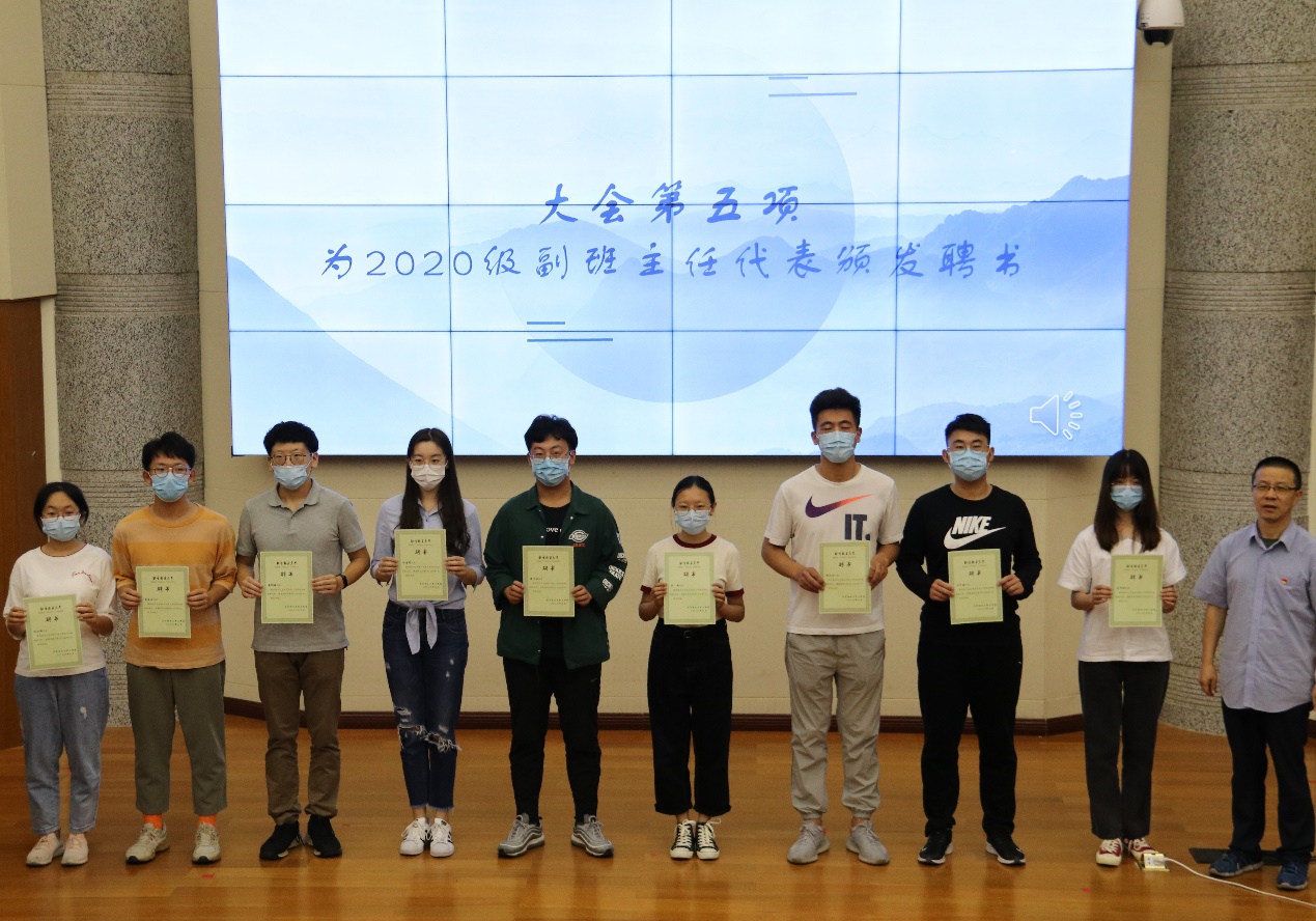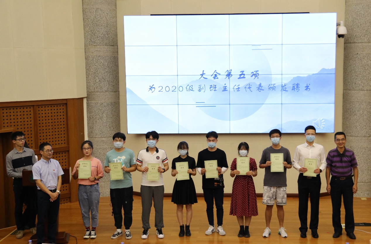 为班帮助新生更快适应大学生活,更好成长,学院为每个本科新生班级选配了2-3名副班主任,由优秀的大三学生担任。会上,工学院科研副院长赵东、行政副院长田振坤、党委组织员曹怀香为2020级副班主任代表颁发了聘书,并合影留念。
