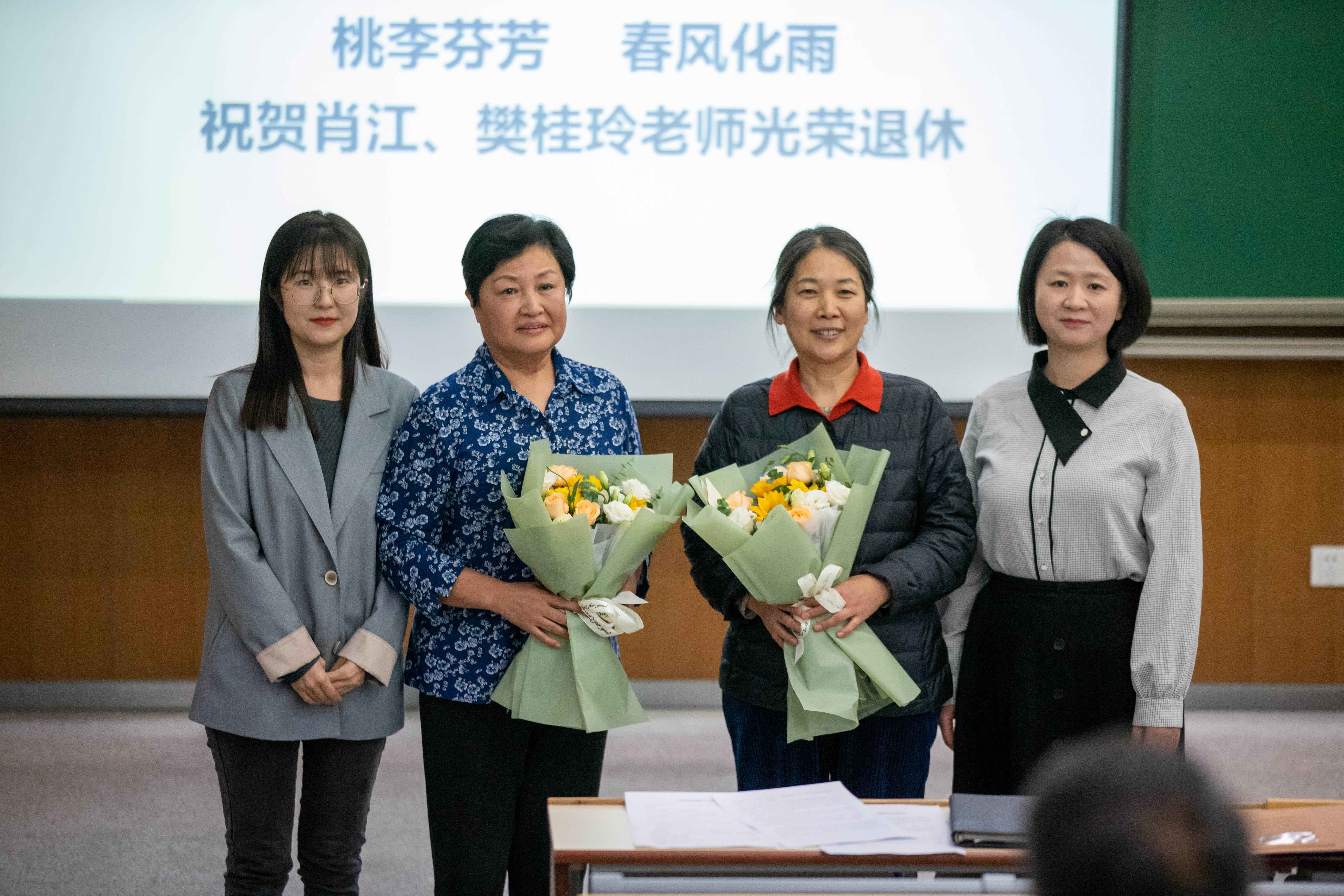 学院肖江教授、樊桂玲老师于今年9月光荣退休。赵东院长会上介绍了两位老师从教生涯的光荣事迹,并代表学院对两位老师的辛劳付出,以及对学院发展做出的贡献表示感谢。肖江老师和樊桂玲老师分别发表了退休感言,表达了对学院的不舍与祝福。