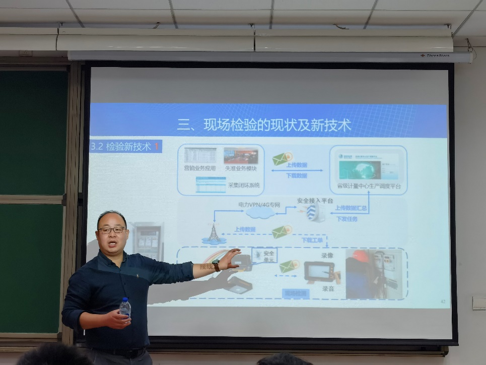 李贺龙研究员结合自身的工作经历,围绕电气测量技术的现场检验历史、检验要求、检验现状及检测新技术等三方面内容,深入浅出地为参会师生介绍了新中国成立以来电能计量相关政策和标准的更迭,讲解了电能测量现场所用到的器材和实际工作中面临的问题,并对电能计量方向的新技术和新方向进行了展望。