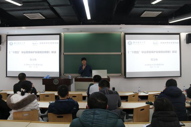 程宝栋解读了《“十四五”林业草原保护发展规划纲要》,介绍了《规划纲要》的起草过程和总体考虑,并着重介绍了山水林田湖草沙系统治理、科学绿化、科学治沙、生态系统提质增效等问题。