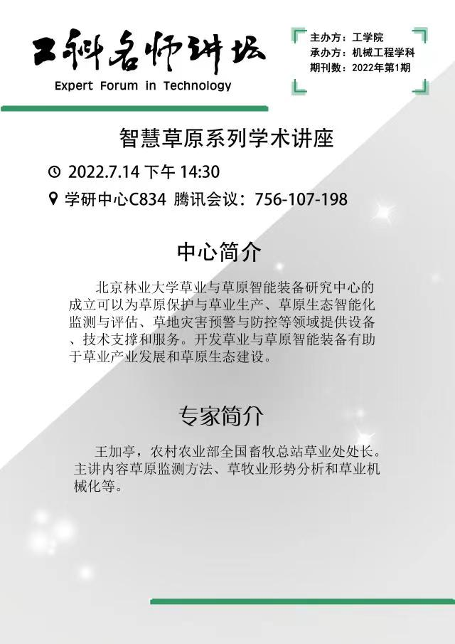 714日下午,农业农村部全国畜牧总站草业处处长王加亭博士应我院邀请,在学研中心C834作了题为“我国草业机械化与草原信息化”的学术讲座,本次讲座是工科名师讲坛2022年度系列活动之一,也是北京林业大学草业与草原智能装备研究中心举办的智慧草原系列学术讲座的首次活动。此次讲座采用线上线下结合的方式同步进行,来自我院、草业与草原学院的近百位师生参加了此次讲座,讲座由我院院长赵东教授主持。