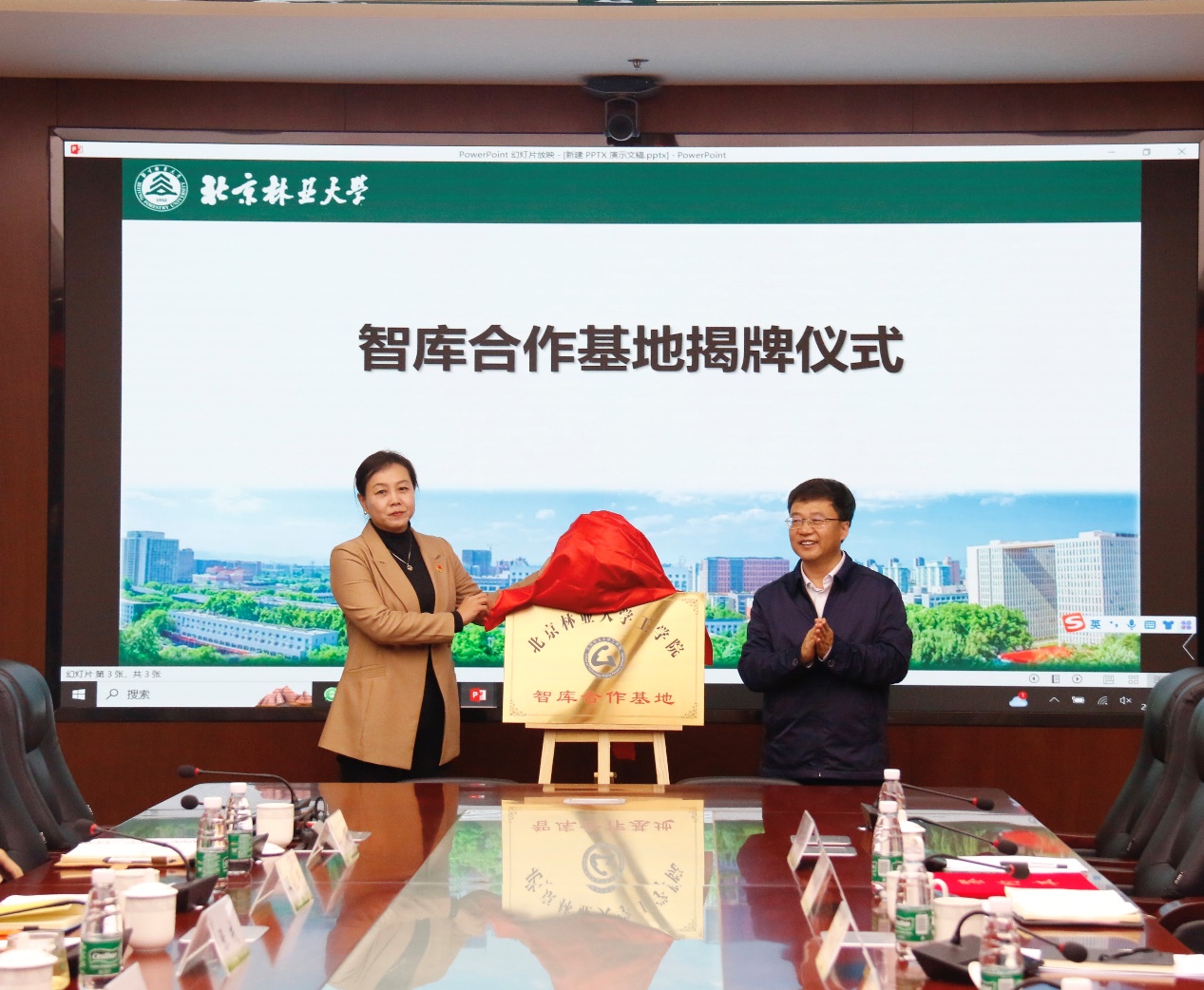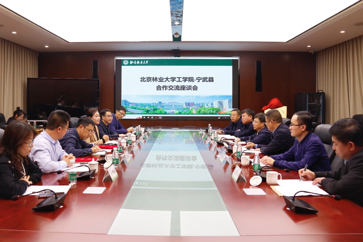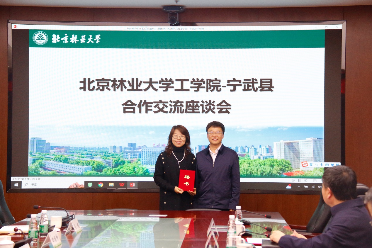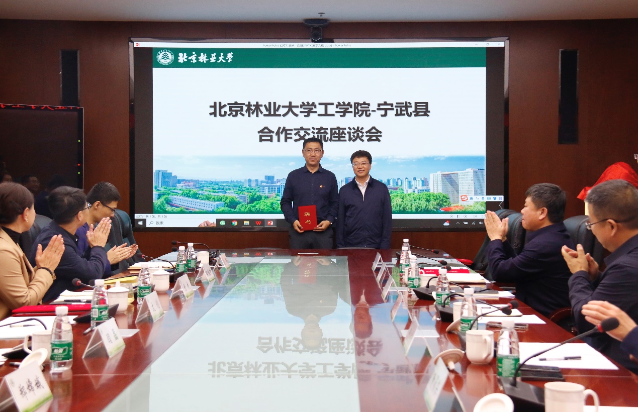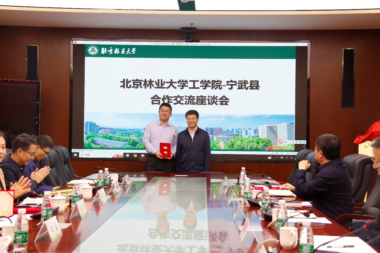 我院相关负责人介绍了学院的发展历程及主要研究方向等情况。双方代表签署校地合作战略协议。双方负责人共同为“北京林业大学工学院智库合作基地”揭牌。高建文代表宁武县委、县政府为我院教授颁发了顾问聘书。
