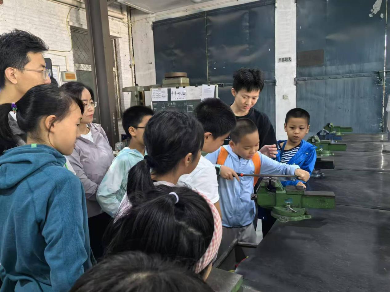 学生车辆党支部成员立足工学专业特色,围绕焊工、车工、钳工三大领域及汽车发动机工作原理等方面,在金工厂实验教学中心负责老师指导下,向社区小朋友们讲解专业知识,带领他们参观学院自主设计的专业比赛模型作品,并鼓励大家动手操作学习,在实践中体验工学魅力。